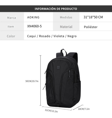 La mochila impermeable Aoking XN40605 es la elección perfecta para quienes buscan funcionalidad y estilo en su día a día. Con una capacidad de 27 litros, este modelo urbano está diseñado tanto para hombres como para mujeres, ofreciendo un espacio amplio para llevar todo lo necesario, desde libros hasta dispositivos electrónicos. Fabricada en poliéster reforzado, esta mochila no solo es resistente, sino que también cuenta con características antirrobo que garantizan la seguridad de tus pertenencias. Su cierre metálico y su diseño inteligente te permiten moverte con confianza en entornos urbanos, mientras que su profundidad de 18 cm asegura un perfil delgado y cómodo. Además, la mochila incluye un compartimento especial para laptop, lo que la convierte en una opción ideal para estudiantes y profesionales en movimiento. También cuenta con un bolsillo para botella y una correa de pecho que proporciona mayor estabilidad y comodidad durante su uso. Con su diseño a prueba de agua, la mochila Aoking XN40605 es perfecta para cualquier clima, permitiéndote disfrutar de tus actividades al aire libre sin preocupaciones. Ya sea que te dirijas a la universidad, al trabajo o a una aventura urbana, esta mochila es tu compañera ideal.