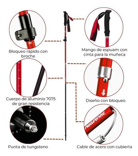 La punta de tungsteno ofrece una tracción excepcional en diversas superficies, permitiendo que explores sin preocupaciones. Equipados con un sistema anti-shock, estos bastones reducen el impacto en tus articulaciones, haciendo que tus caminatas sean más placenteras. La correa de muñeca añade un nivel extra de seguridad, evitando que se te escapen en momentos de mayor exigencia.